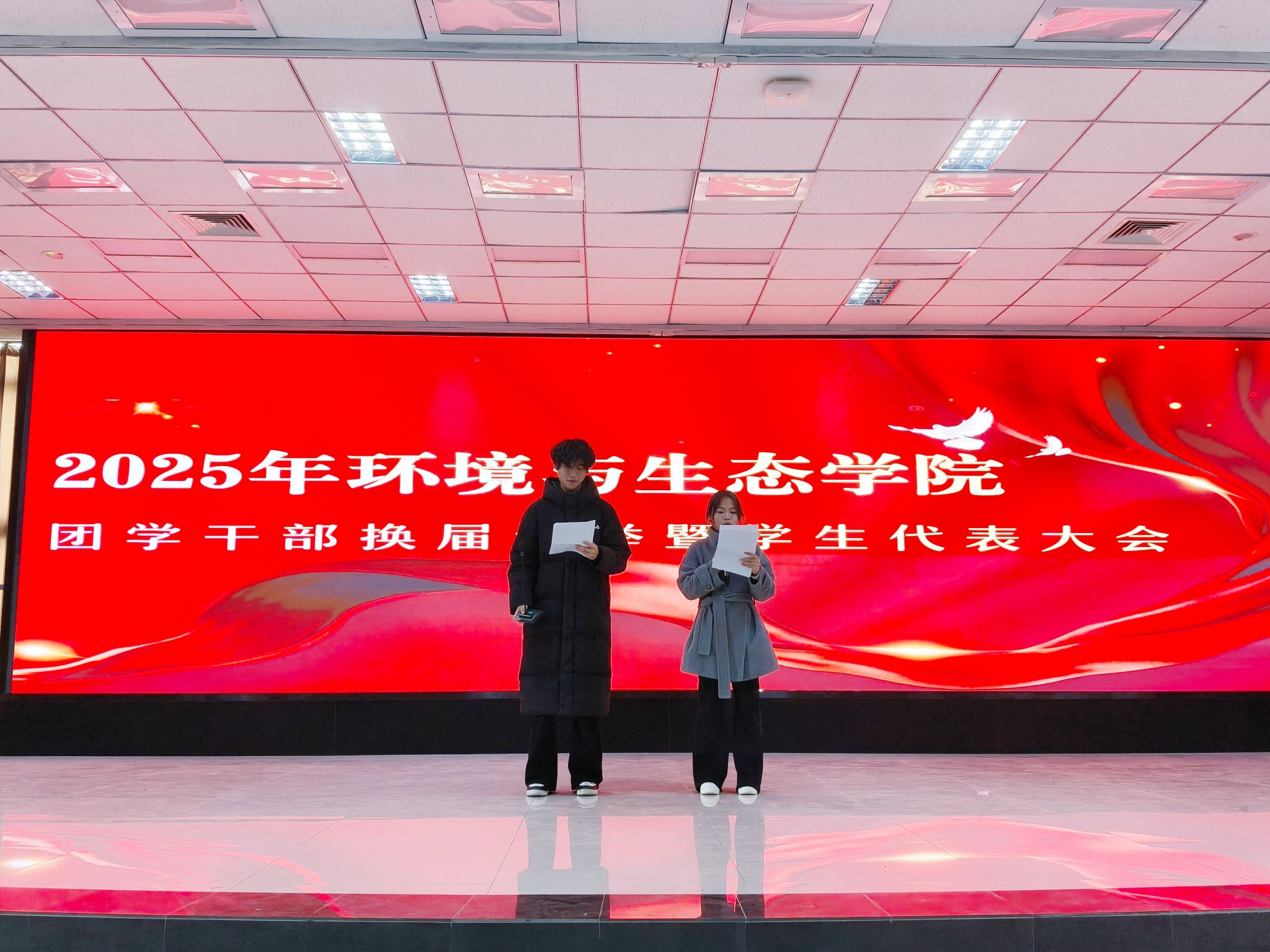 为加强团学组织建设,推进学生工作有序传承,12月9日,环境与生态学院“第五届团学干部换届选举暨学生代表大会”在德礼讲堂二楼隆重召开。学院党总支书记邢伟明、党总支副书记何欢、学生群团办公室主任王慧娟及各辅导员出席会议,全院120名学生代表参会,共同见证团学组织的新老交替与使命传承。大会在庄严的国歌声中正式拉开帷幕。