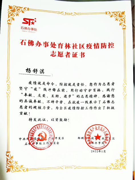 紧急时刻,家住该小区的我校党员教师杨舒淇第一时间报名加入社区党员先锋队,每天早上六点半开始协助医护人员挨家挨户上门做核酸检测,重点照顾小区内的孤寡老人;中午在楼下执勤,协助居民做好居家隔离服务工作;下午两点至六点为小区居民送菜。在医护人员、社区工作人员和志愿者们连续十几天无怨无悔付出和共同努力下,最终在新年到来之际迎来了小区解封。志愿者们的工作到了高新区领导的高度认可,并获得了表彰。