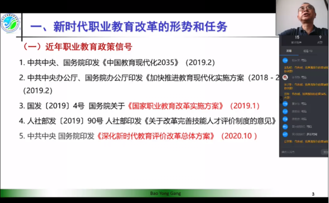 包永刚处长通过钉钉直播作了《落实“1+X”证书制度,推进“三教”改革》主题报告。他清晰梳理了新时代职业教育改革的形势和任务,从“优化人才培养方案”、“推进‘三教’改革”、“开展‘课堂革命’,构建‘活力课堂’”三个方面深入探讨了“1+X”证书制度下的教学改革方向,并就“1+X”证书制度试点工作的实施提出了宝贵的建议。